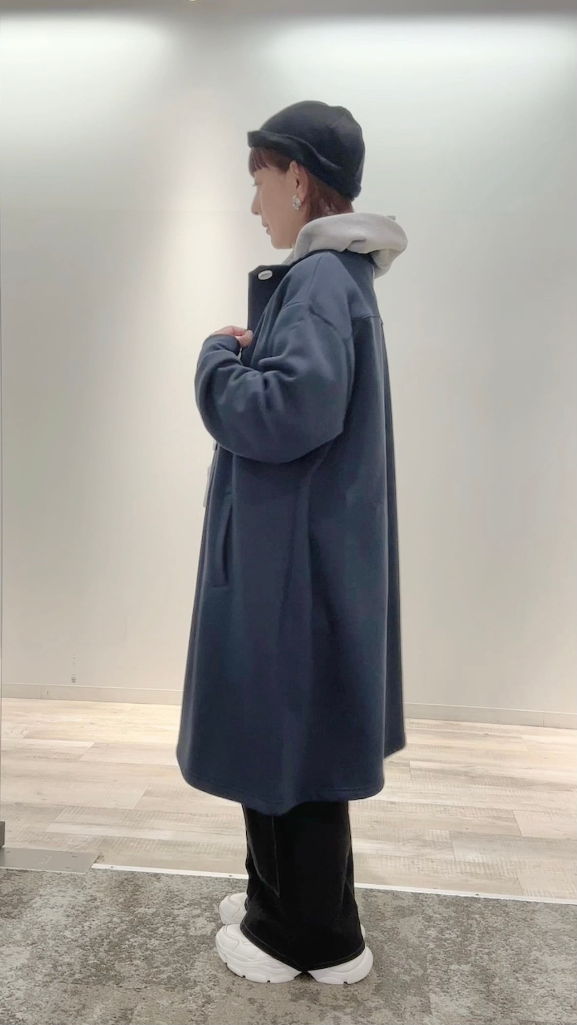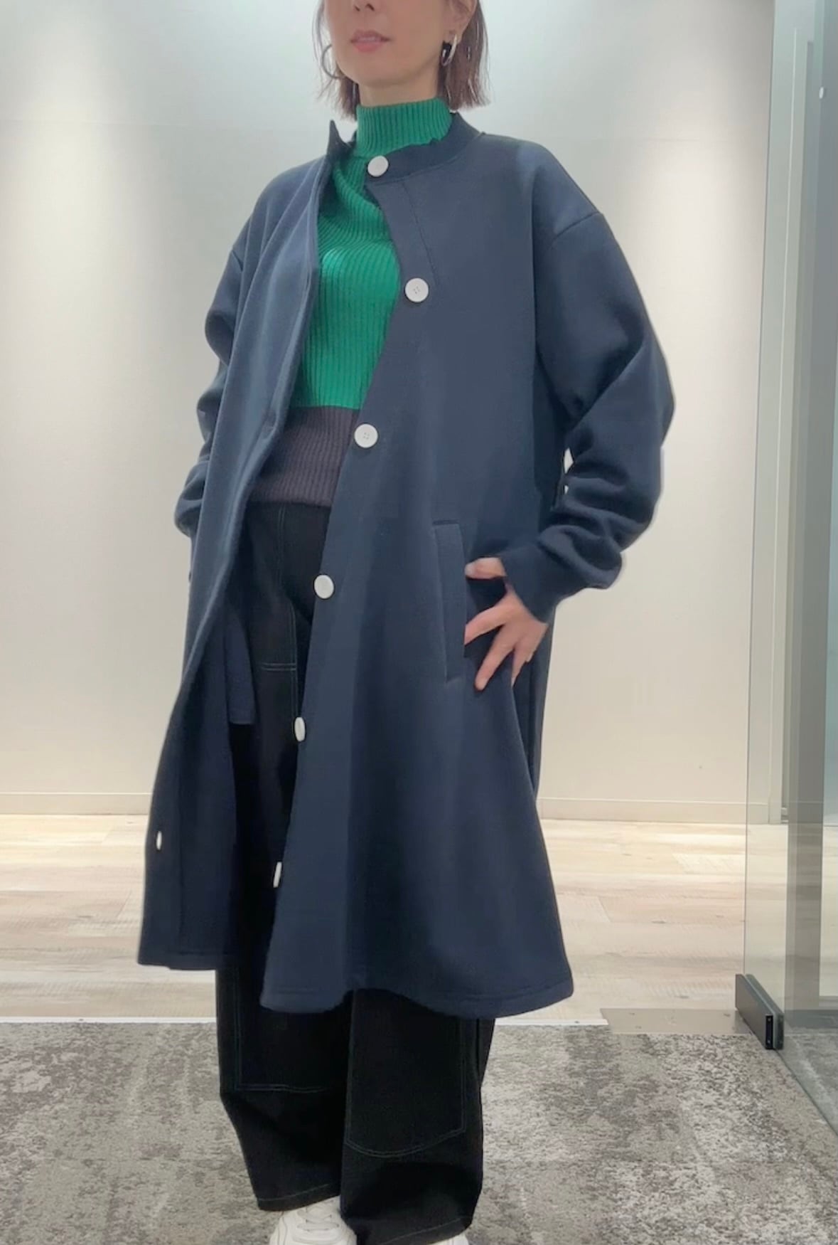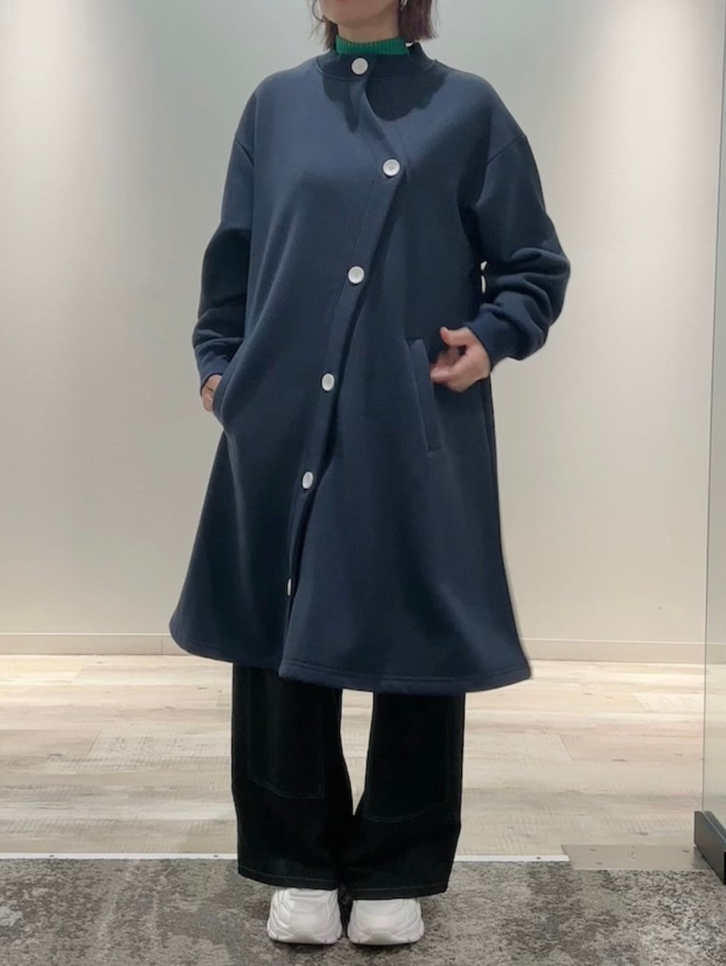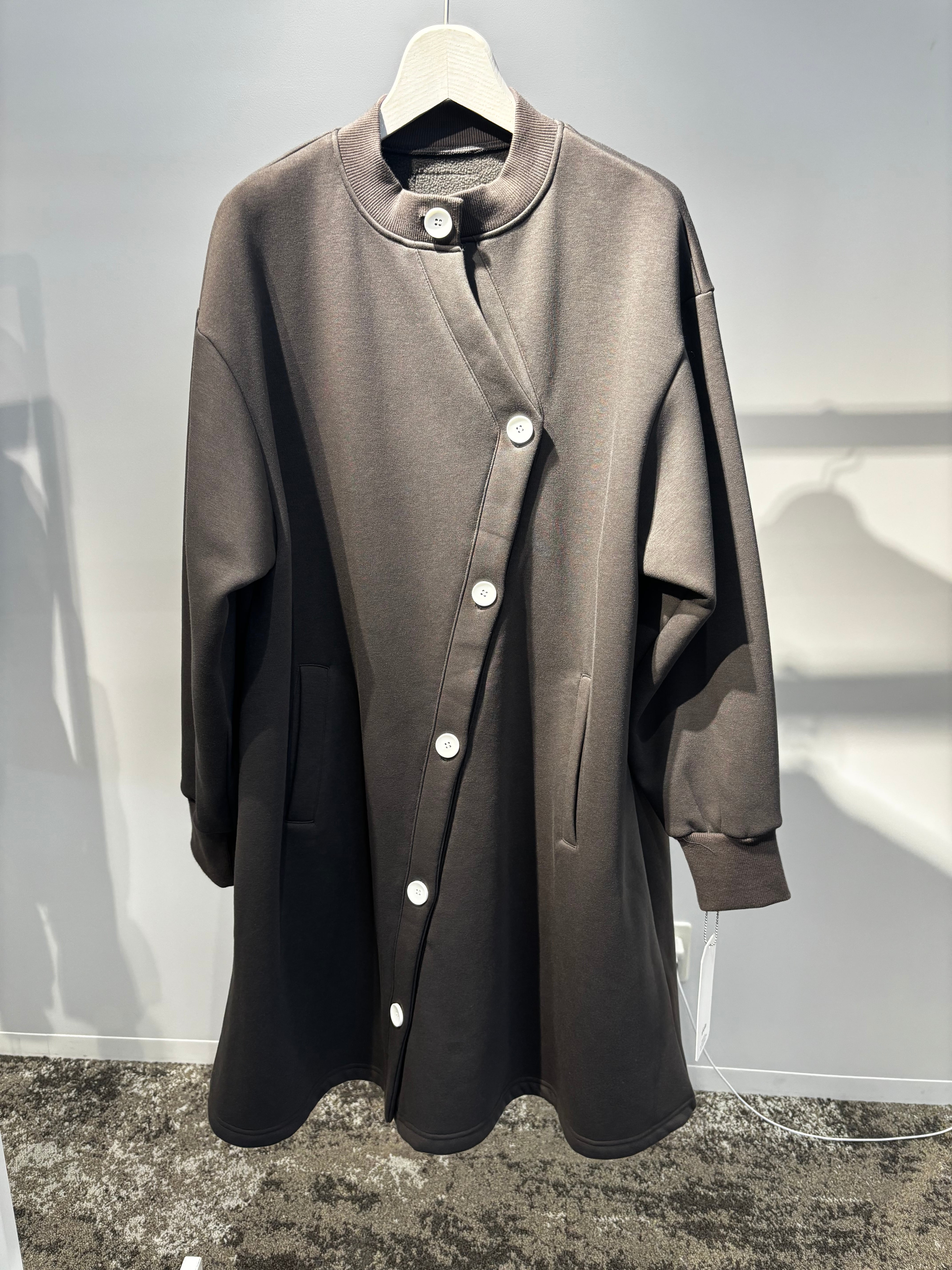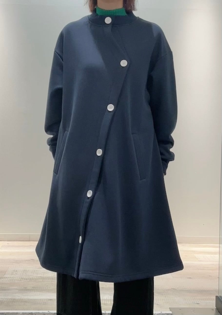 フロントは斜めに留めても楽しめるアシンメトリーデザインで、スタイリングに遊び心をプラスします。すっきりとしたノーカラー仕立ては、インナーにタートルネックやフーディーを合わせてももたつかず、幅広い着こなしに対応。
