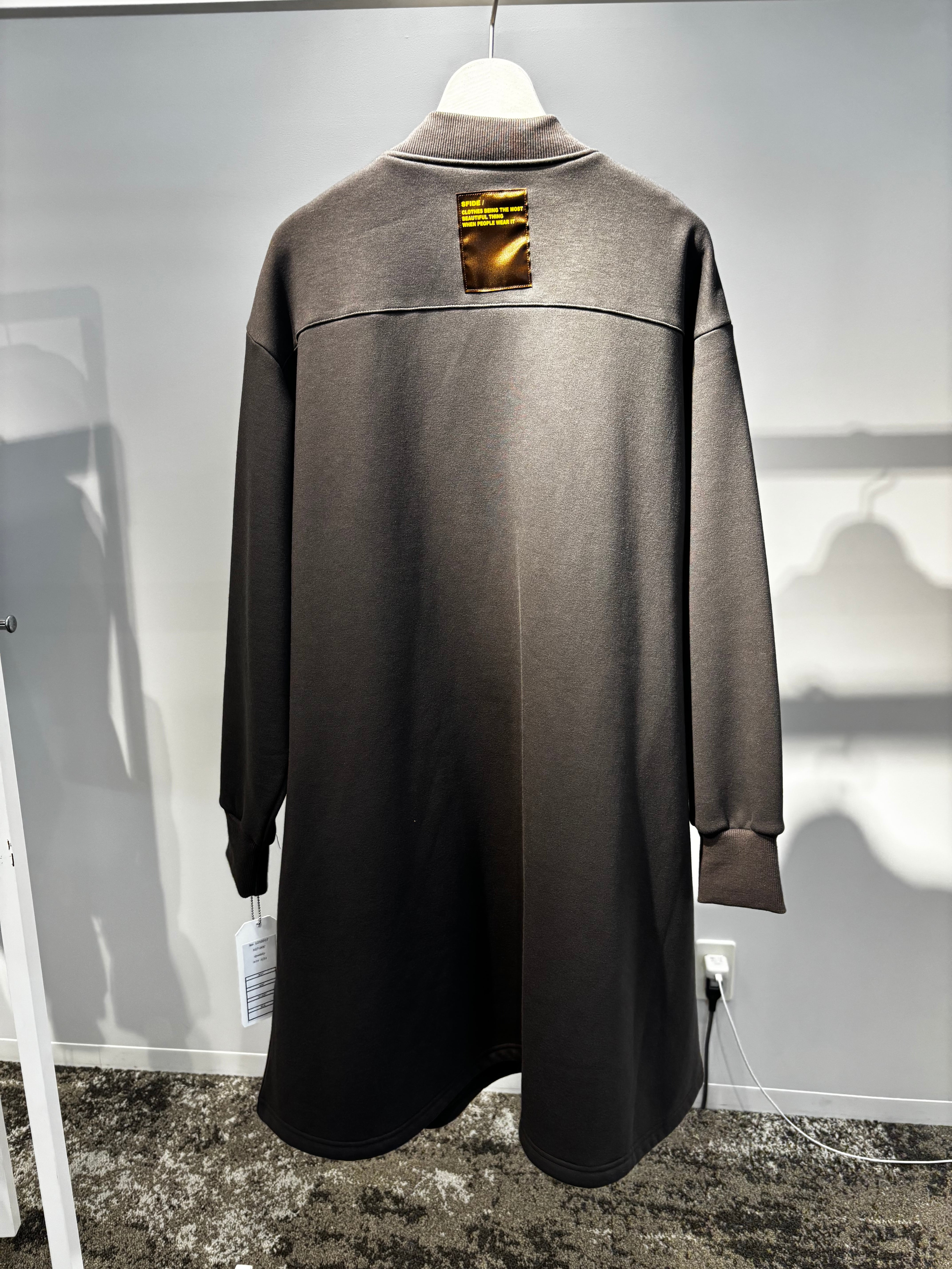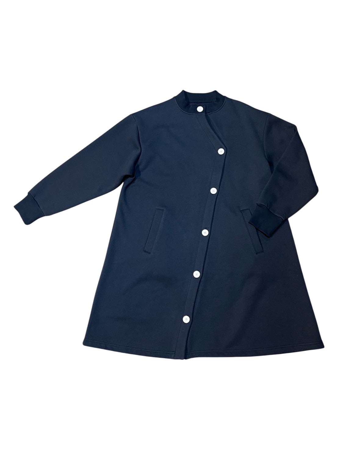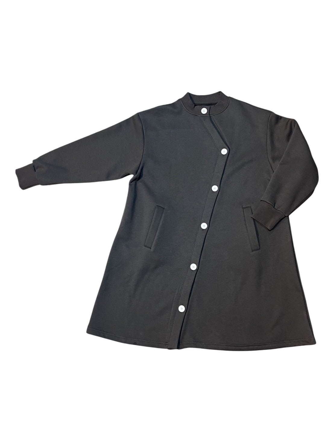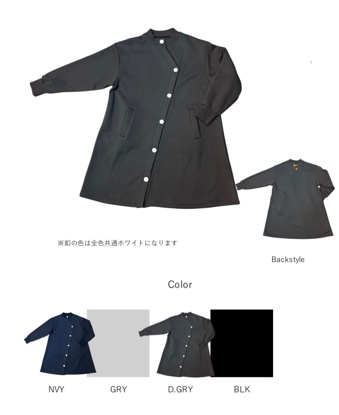 フロントは斜めに留めても楽しめるアシンメトリーデザインで、スタイリングに遊び心をプラスします。すっきりとしたノーカラー仕立ては、インナーにタートルネックやフーディーを合わせてももたつかず、幅広い着こなしに対応。