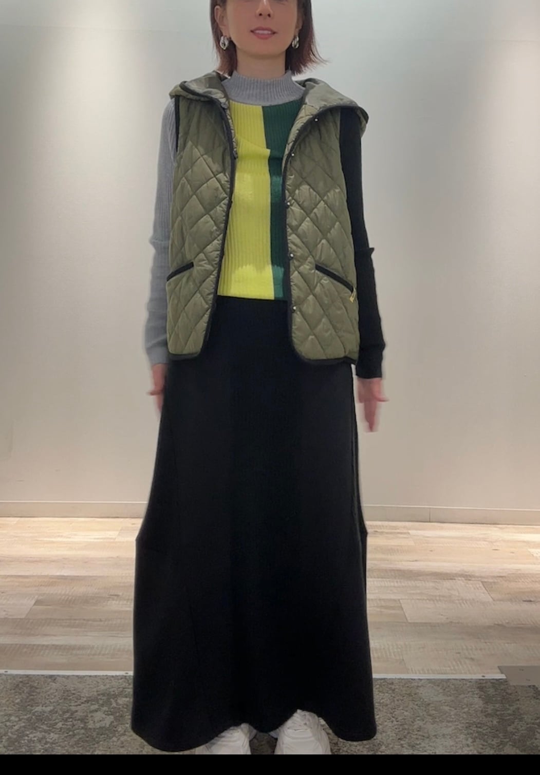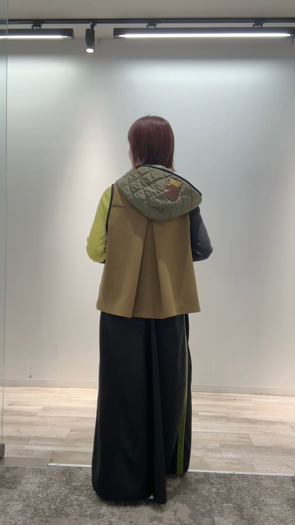フロントはキルティング加工を施した軽快なナイロン素材、バックはハリ感のあり、前後で印象の異なるデザインが楽しめます。後ろには深めのタックを入れ、動くたびに揺れる立体的なシルエットを演出。