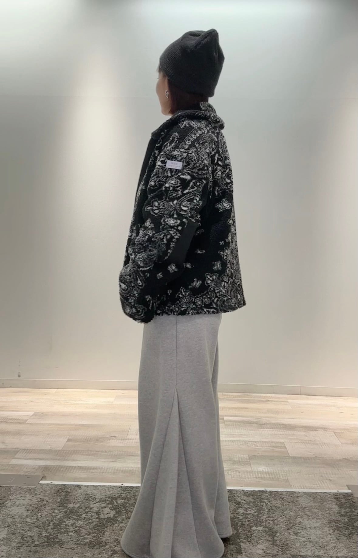 バックスタイルにも大きく柄が施されており、360度どこから見ても存在感抜群。袖口の切り替えやフロントのアクセントラインにはモードな要素を取り入れ、カジュアルながら洗練された印象に仕上げています。