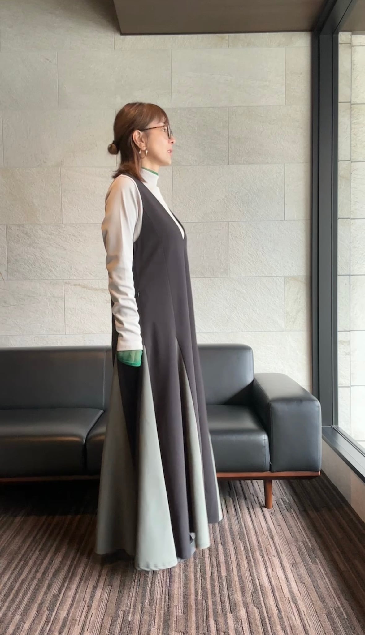Vネックのすっきりとした上半身と、裾に向かってドラマチックに広がるAラインシルエットで