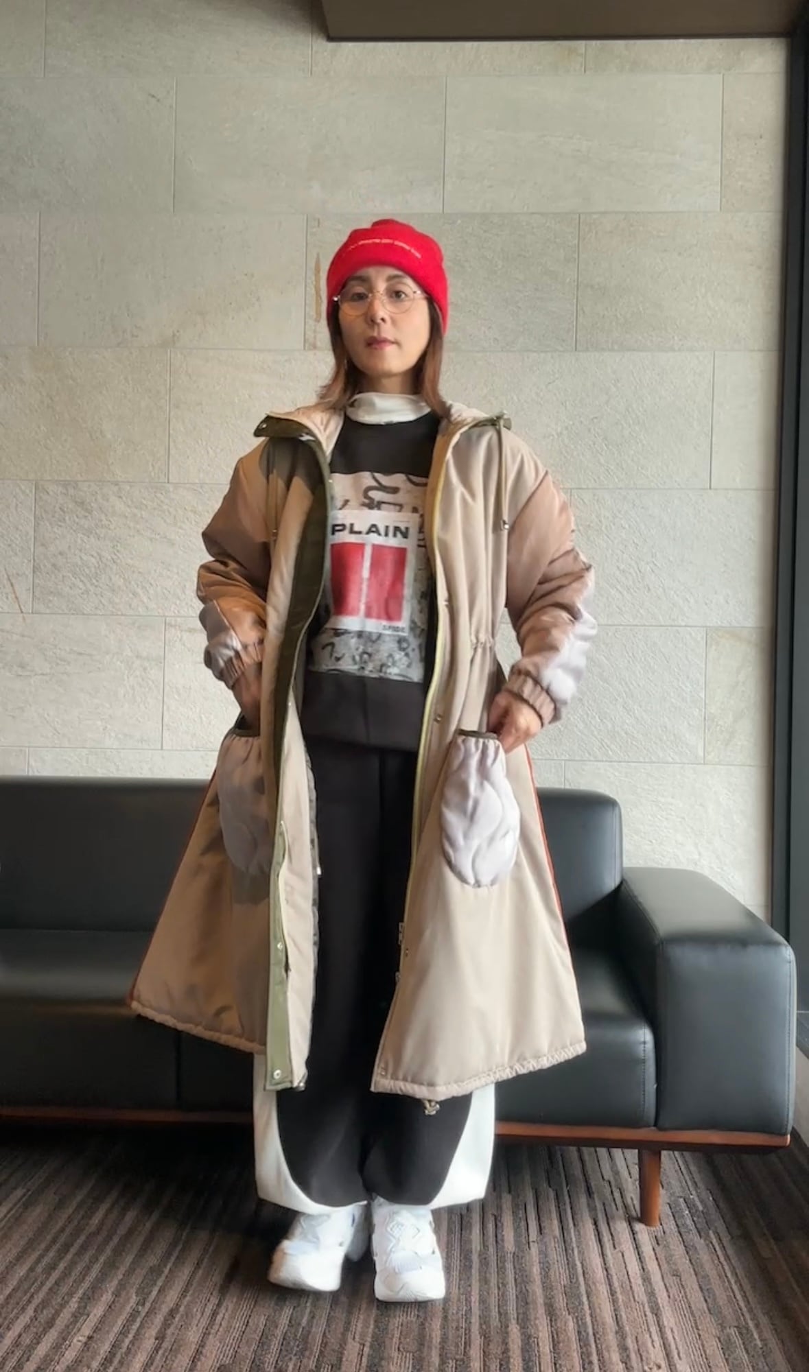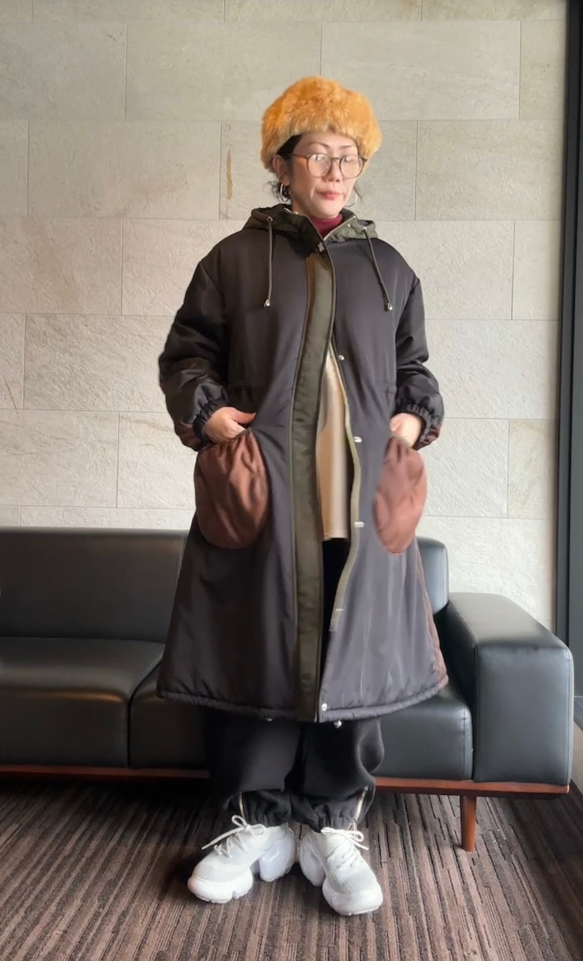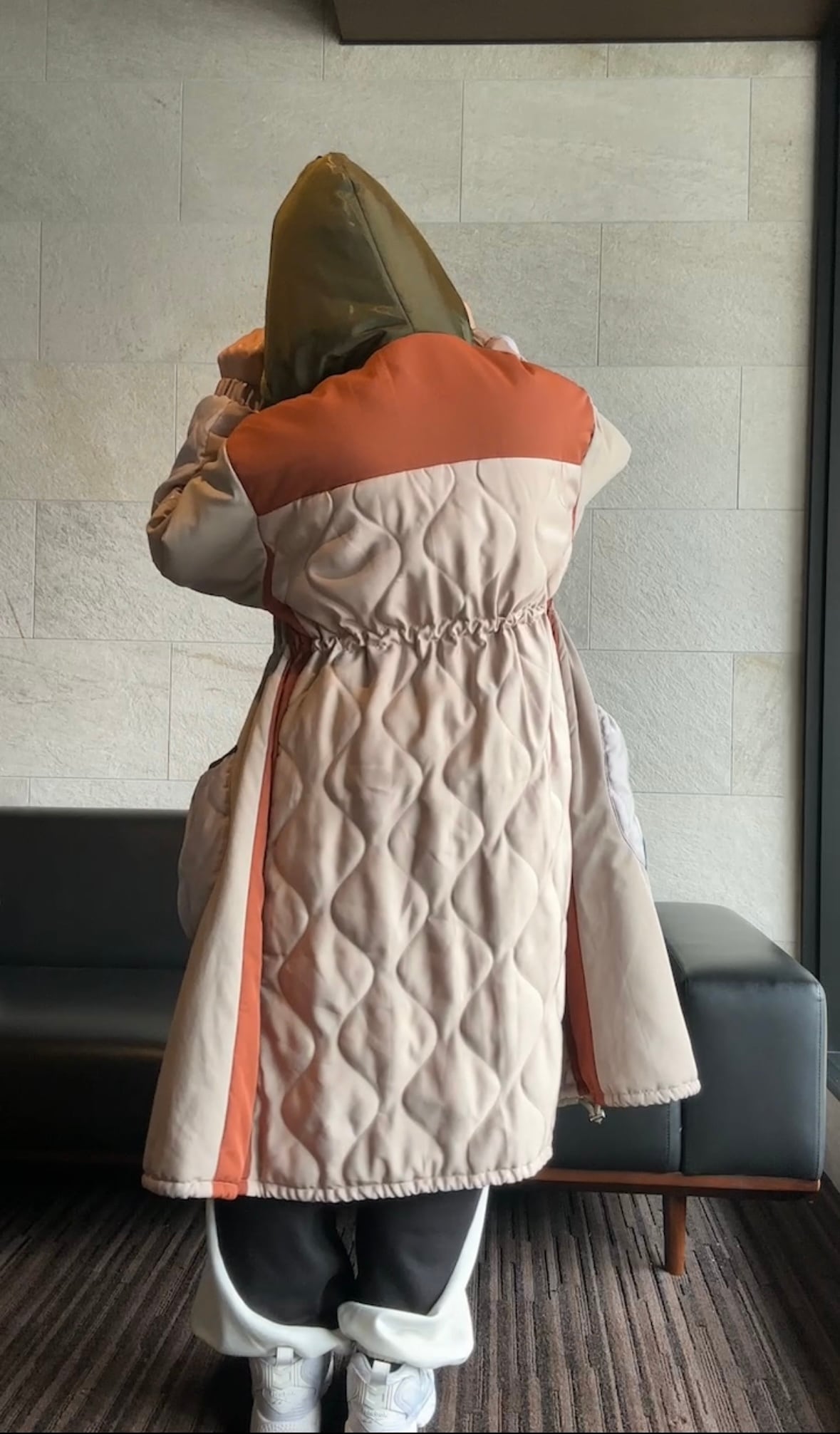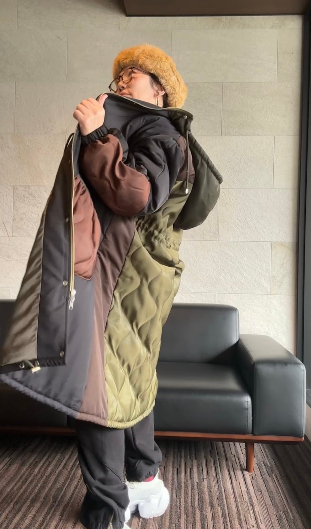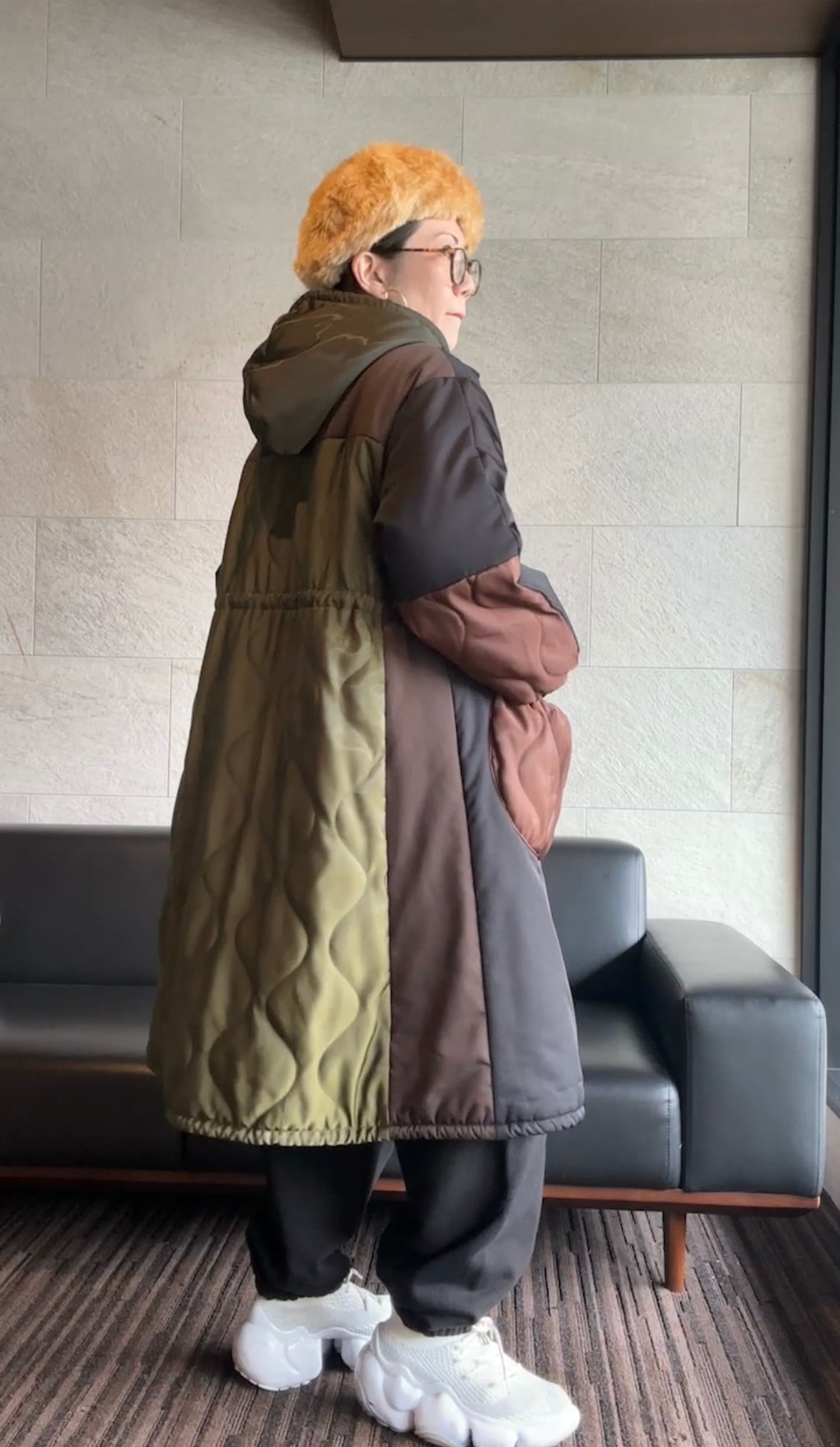 存在感たっぷりのフード付きキルティングロングコート。