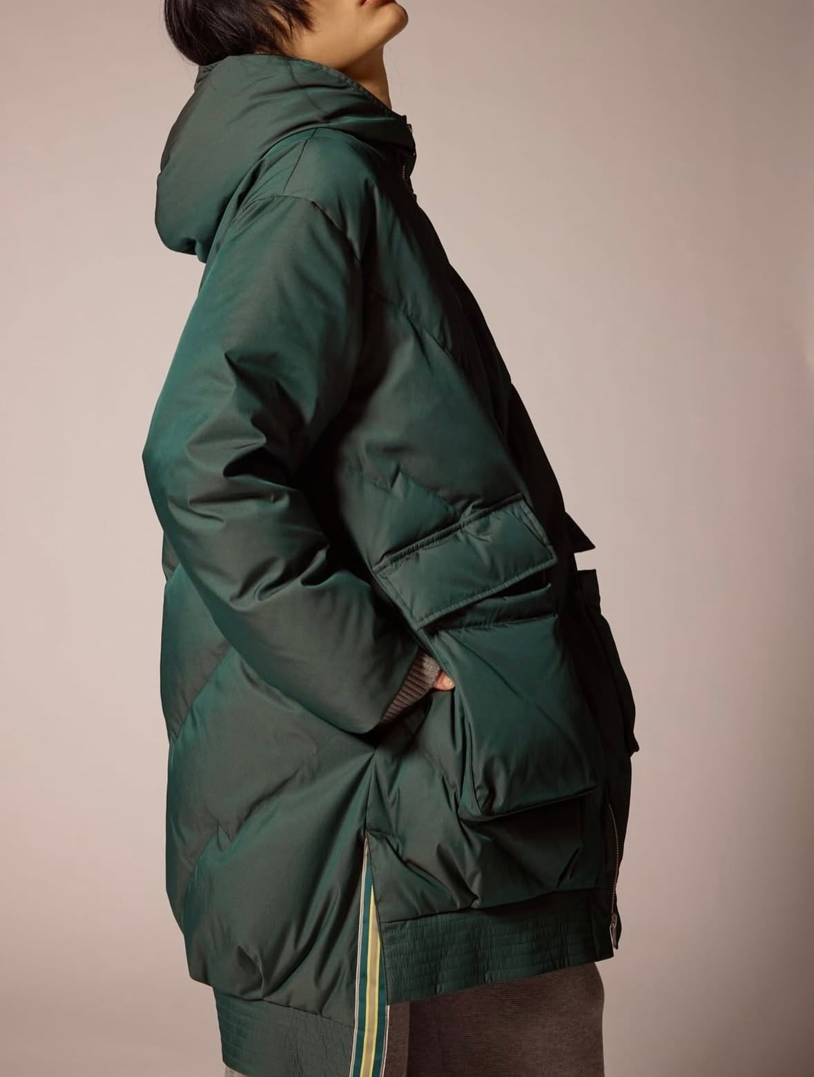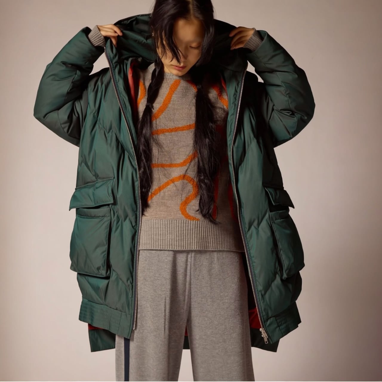 立体的なキルトと大ぶりのフラップポケットが存在感を放ち、ミリタリーのムードをモダンにアップデートしています。