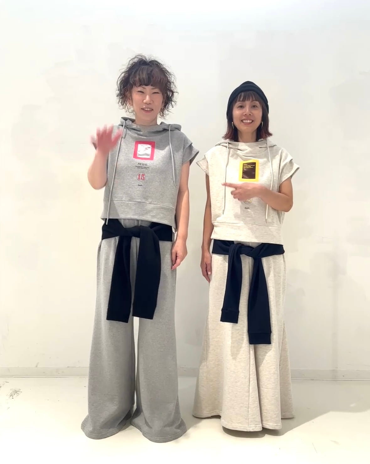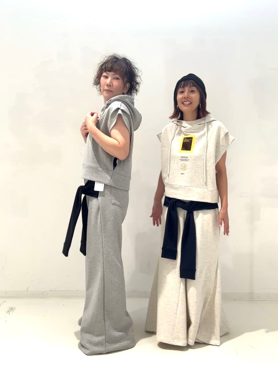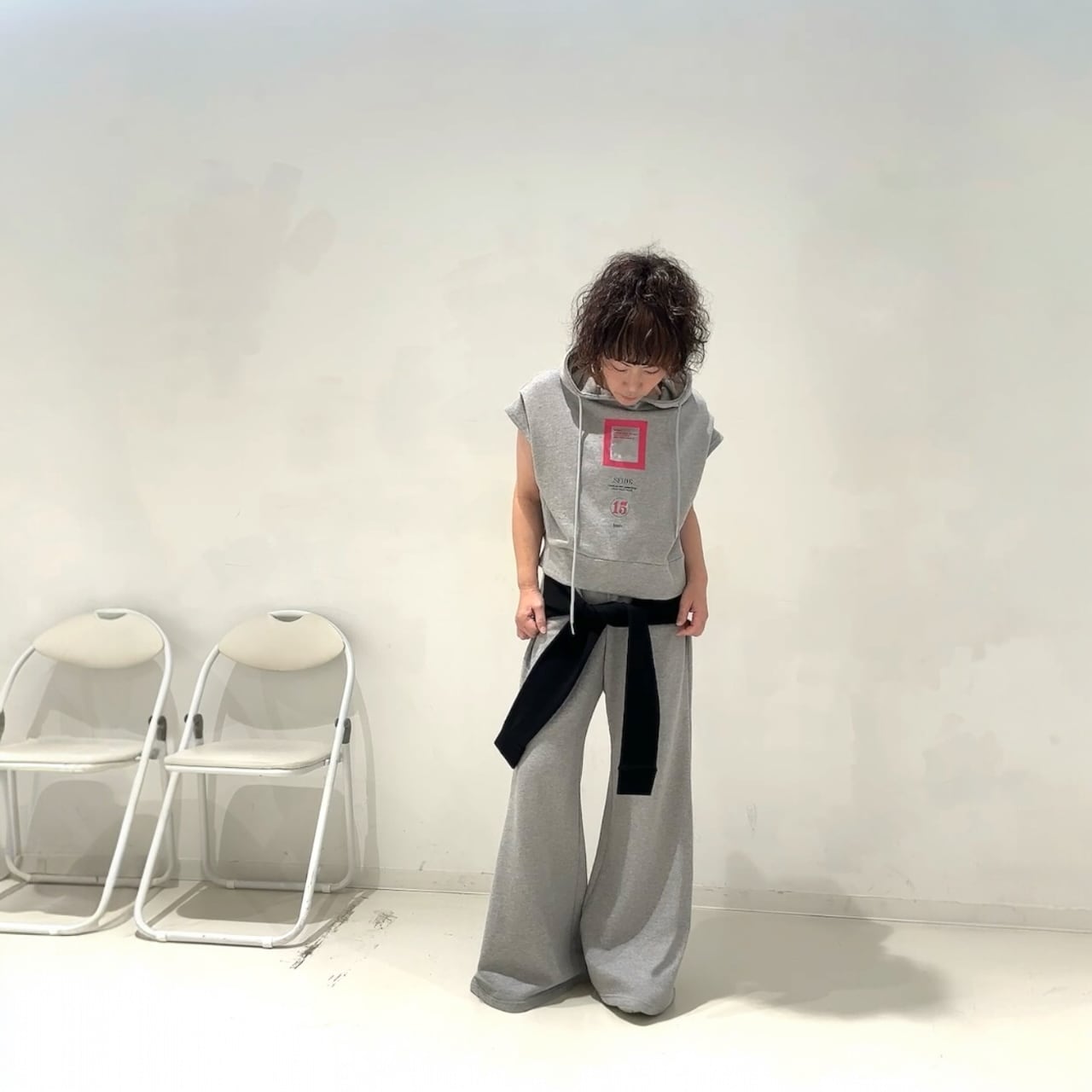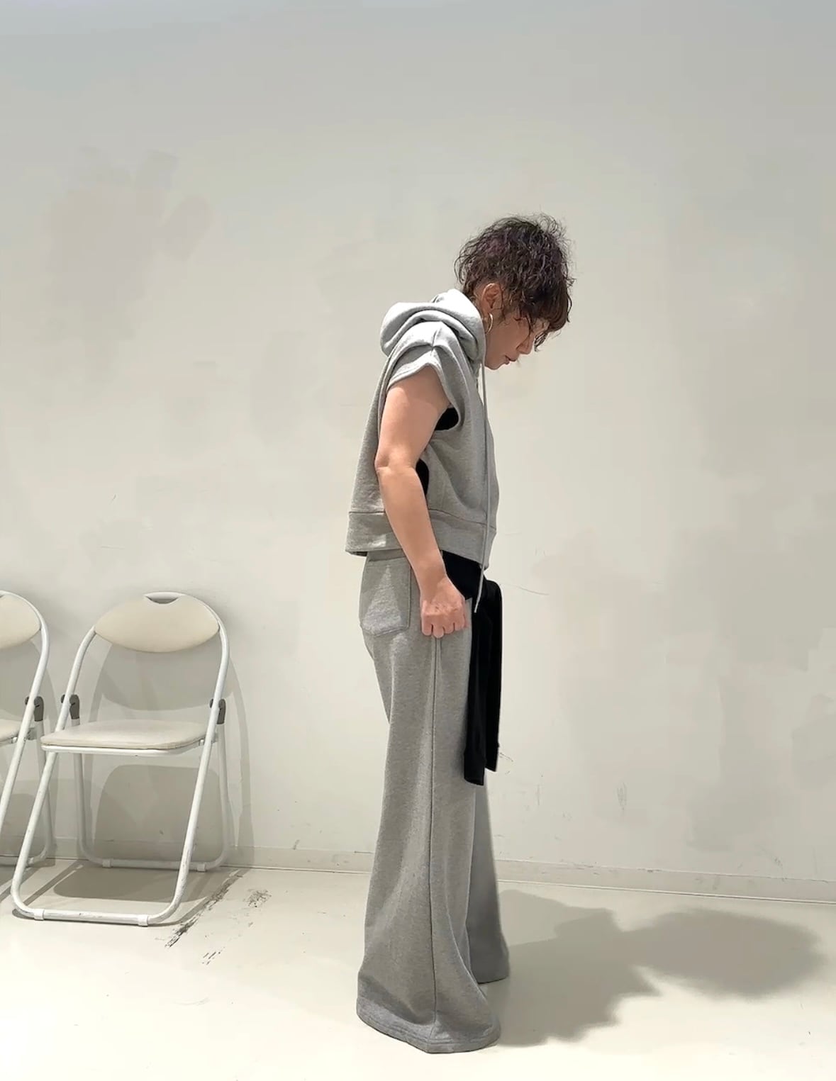 同素材トップスとのセットアップ着用もおすすめです。
