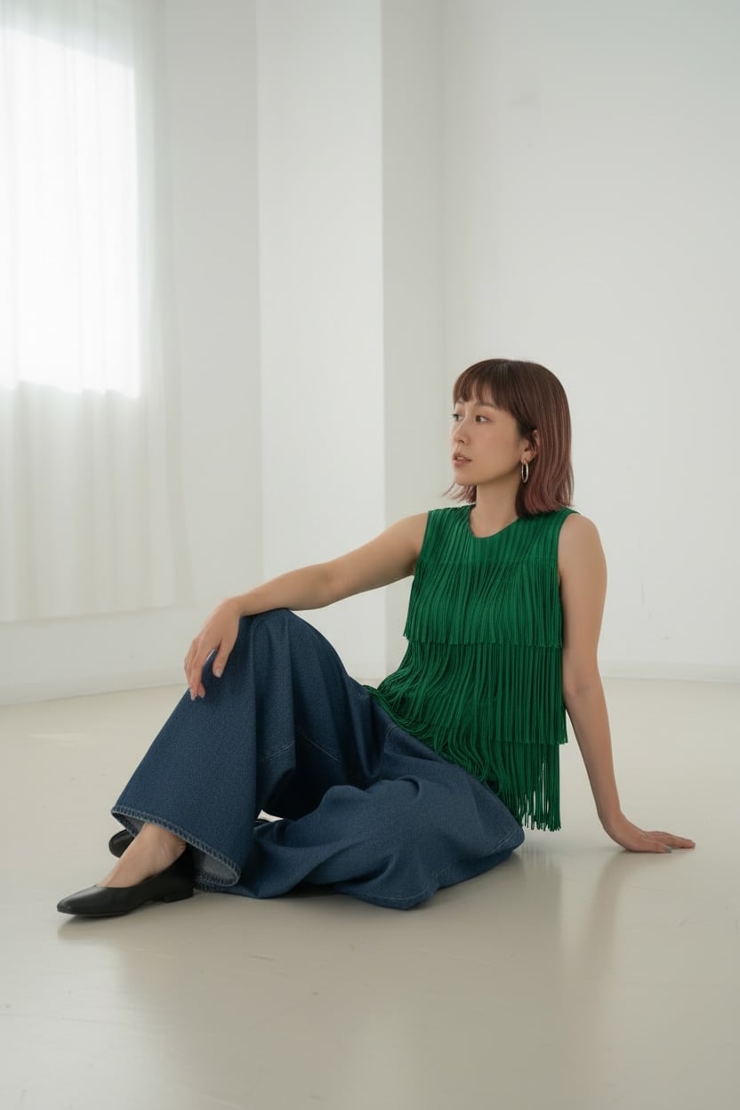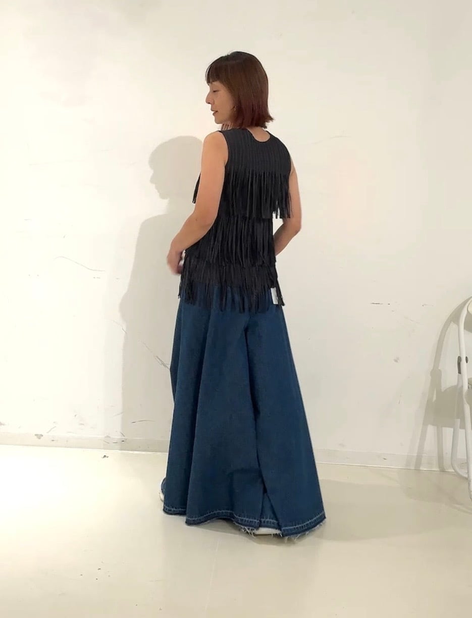 デニムやワイドパンツと合わせたカジュアルスタイルはもちろん、同素材のフリンジスカートと合わせたセットアップスタイルもおすすめ。